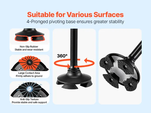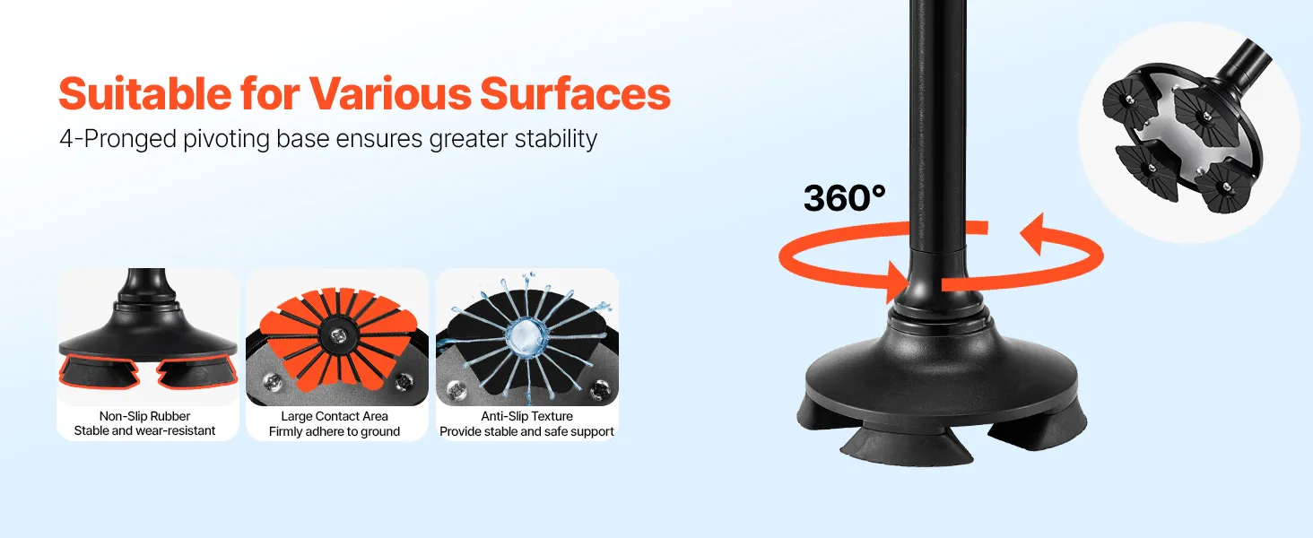 Deze draagbare, lichtgewicht aluminium wandelstok is voorzien van een draaibare vierpuntsbasis met antislipvoetkussens en biedt uitstekende grip en stabiliteit op gras, grind, hardhouten vloeren en tegels.