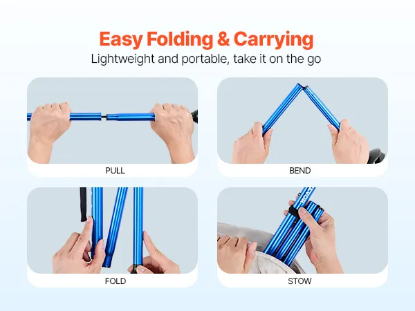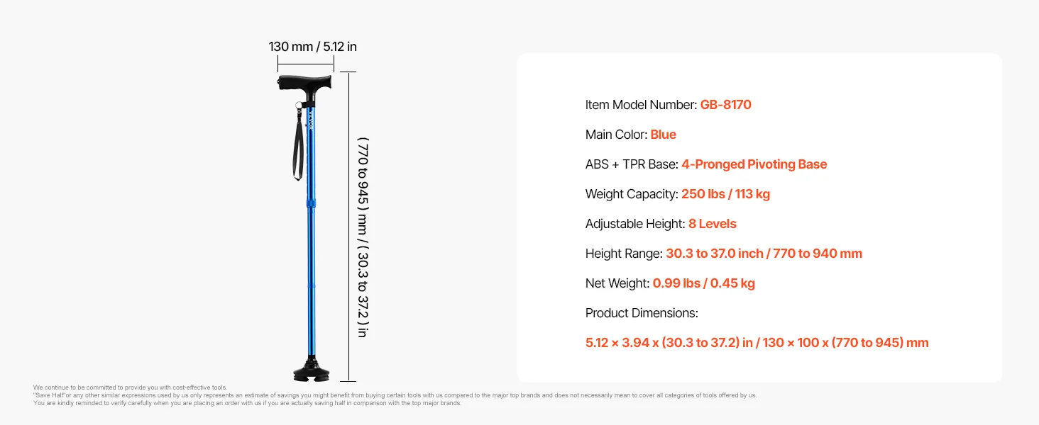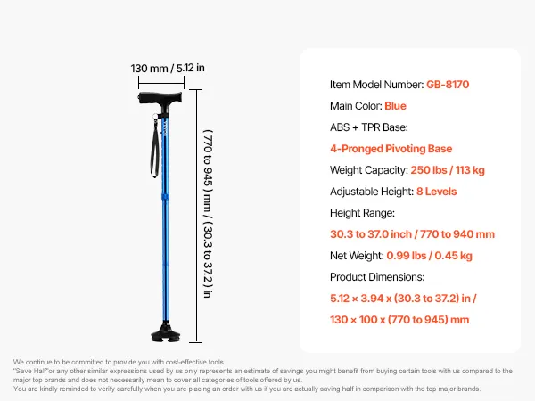 VEVOR Walking Cane for Man Woman, Folding Walking Stick with 8-Level Adjustable Height and 4-Pronged Pivoting Base, Lightweight & Portable Aluminum Mobility Aid for Senior Adult, 250LBS Loading (Blue)