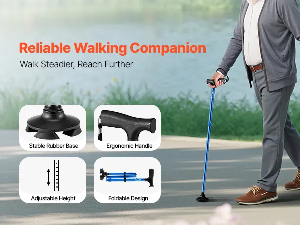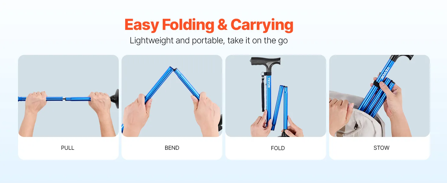 Portable and Easy to Store: Our walking cane for seniors adults is lightweight and portable, featuring a foldable design that allows it to be quickly collapsed into a compact size. It easily fits into a backpack or travel bag, making it a reliable companion for everyday outings or travel adventures.