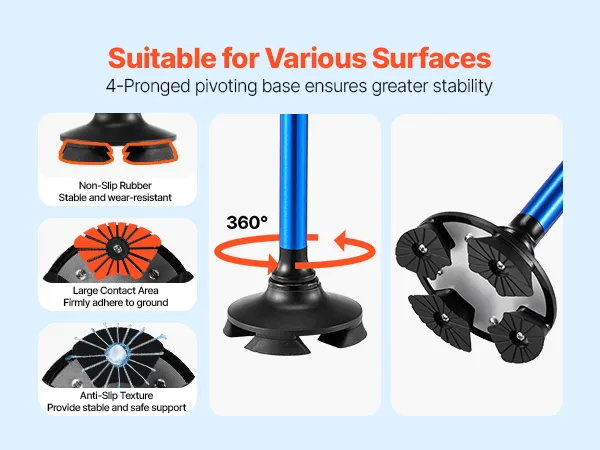 Featuring a 4-prong pivoting base with non-slip foot pads, this aluminum portable lightweight walking cane offers excellent grip and stability on grass, gravel, wood floors, and tiles, ensuring safe and steady walking across various terrains.