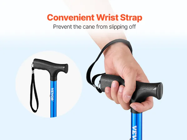 The thoughtful wrist strap prevents accidental dropping of the folding walking cane, enhancing safety during use.