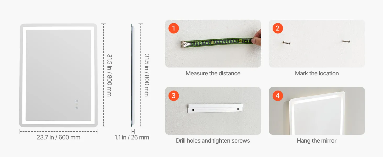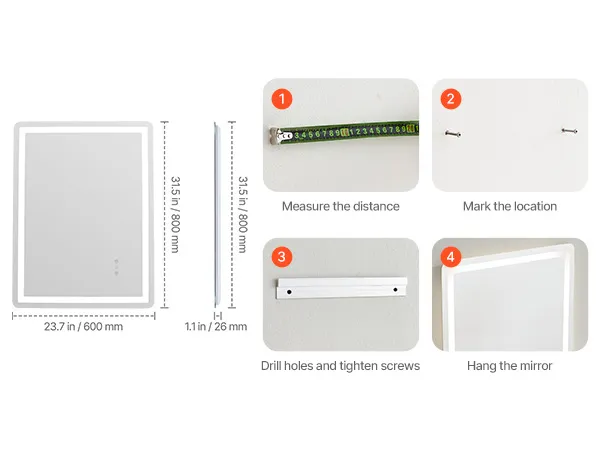 Eenvoudig te installeren: bevestig de Z-vormige wandbeugel aan de muur en hang de LED-verlichte badkamerspiegel verticaal aan de beugel. De installatie is snel en moeiteloos, zonder ingewikkelde stappen: gewoon aansluiten en u kunt aan de slag.