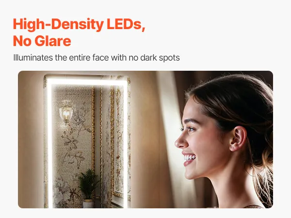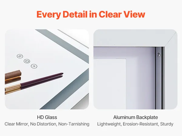 HD-glas: Deze badkamerspiegel met verlichting biedt uitstekende transparantie en visuele helderheid met een nauwkeurige kleurweergave. De epoxyharscoating geeft het glas een extra beschermlaag die het beschermt tegen krassen en beschadigingen door dagelijkse slijtage, waardoor het spiegeloppervlak er als nieuw blijft uitzien en de duurzaamheid en het uiterlijk worden verbeterd.