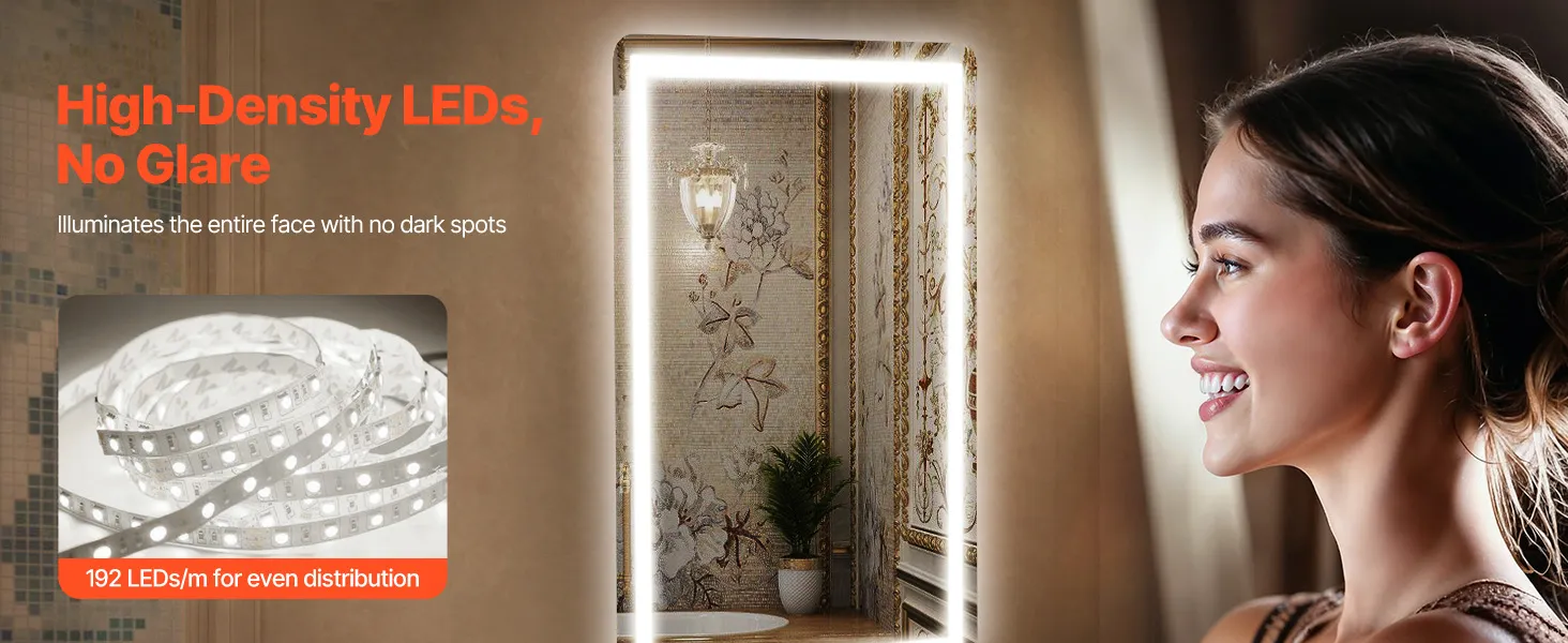 LED's met hoge dichtheid en frontverlichting met achtergrondverlichting: de LED-badkamerspiegel is uitgerust met 192 LED-kralen per meter en biedt een hoge lichtopbrengst. De combinatie van voor- en achterverlichting verbetert de helderheid en zorgt voor schaduwvrij licht met een hoge resolutie tijdens het aanbrengen van make-up of het scheren. Zelfs bij langdurig gebruik wordt vermoeidheid van de ogen vermeden en wordt een aangename lichtervaring geboden
