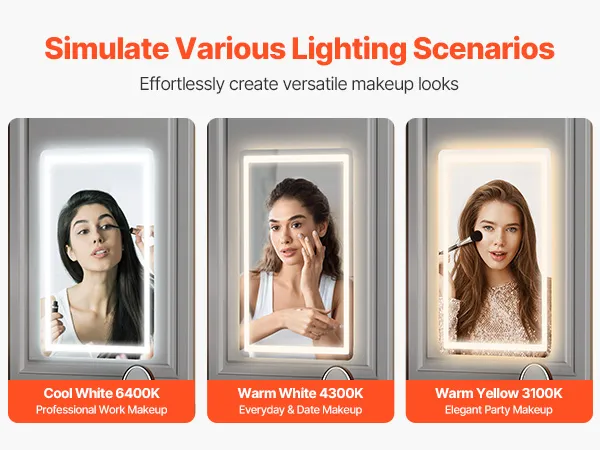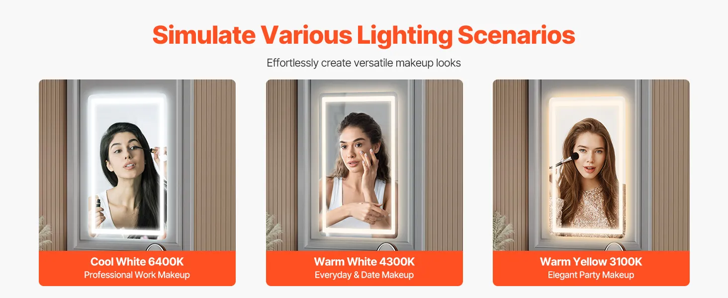 Deze cosmeticaspiegel simuleert verschillende lichtstemmingen en biedt u de mogelijkheid om te wisselen tussen koel wit, warm wit en warm geel om zo de ideale belichting te creëren voor een natuurlijke make-up. Het voldoet moeiteloos aan de verlichtingsbehoeften van verschillende gelegenheden.