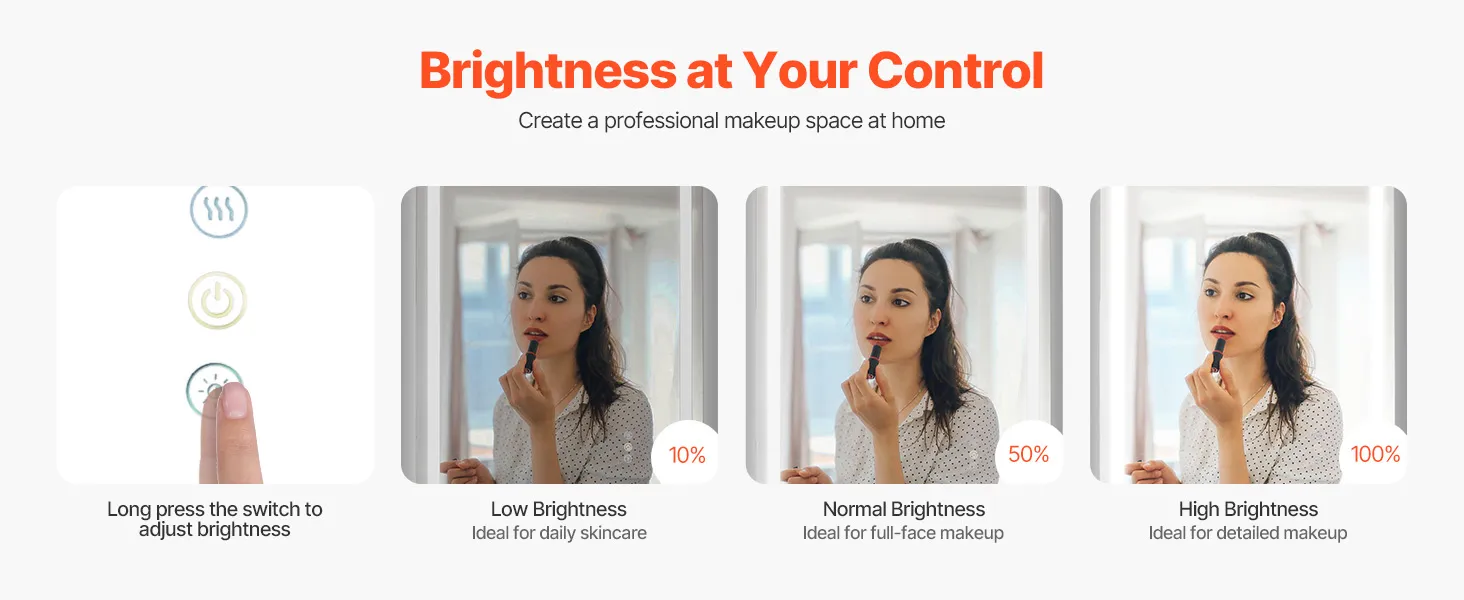 Verstelbare LED-verlichting en geheugenfunctie: deze LED-badkamerspiegel is voorzien van slimme aanraakbedieningen om te schakelen tussen drie kleurtemperaturen - warm geel (3000K), warm wit (3000K) en koel wit (6000K) - en biedt een naadloze helderheidsaanpassing van 10% tot 100 %. De geheugenfunctie slaat uw laatste instellingen op, zodat u de volgende keer dat u de lamp gebruikt altijd nauwkeurige verlichting hebt, zonder dat u de instellingen opnieuw hoeft aan te passen.