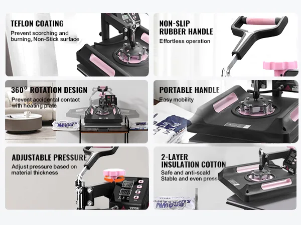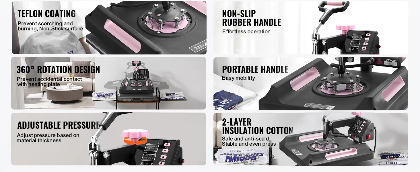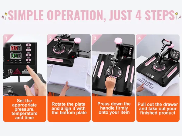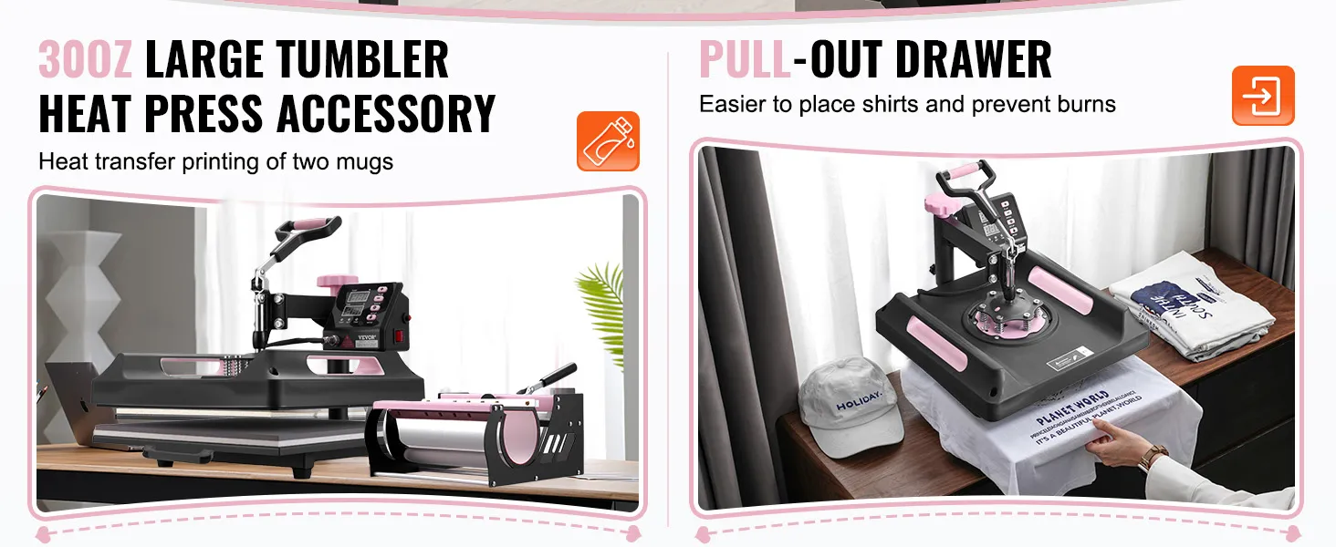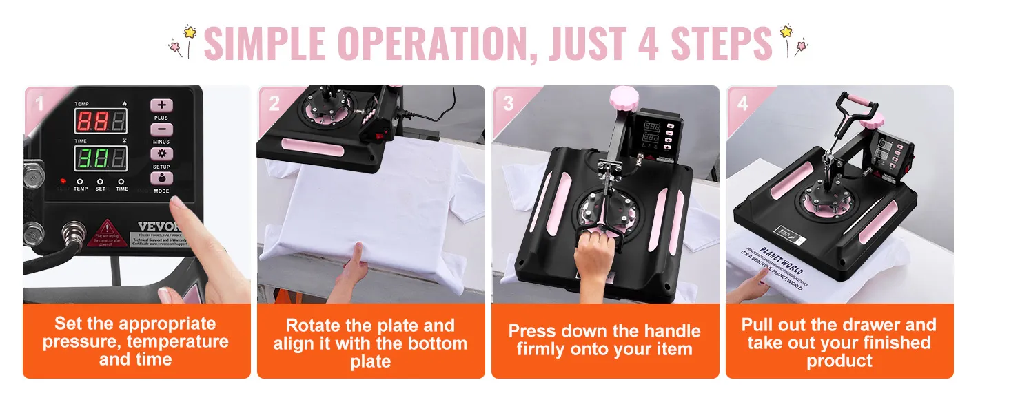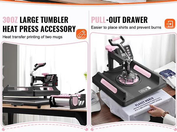 Eenvoudig te gebruiken: aanpassen, drukken en verwijderen - voer het overdrachtswerk in eenvoudige stappen uit, zelfs als u een beginner bent. Nadat de overdracht is voltooid, kunt u dankzij het unieke uittrekbare ladeontwerp van onze warmteoverdrachtmachine het eindproduct eenvoudig verwijderen zonder dat u zich zorgen hoeft te maken over het risico op brandwonden.