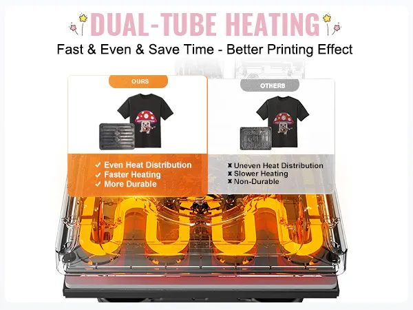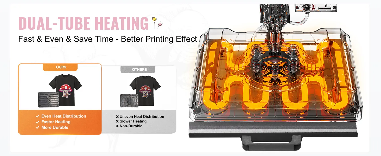 Dubbele buisverwarming: de hemdenpers maakt gebruik van geavanceerde dubbele buisverwarmingstechnologie voor snelle verwarming en een gelijkmatigere warmteverdeling, zodat elke centimeter van het persoppervlak de ideale temperatuur bereikt. Dit verbetert de uniformiteit, helderheid en kleurgetrouwheid van de overgedragen motieven.