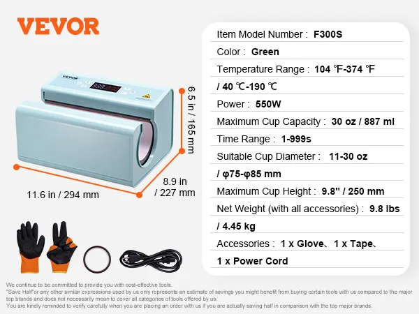 VEVOR Auto Tumbler Heat Press Machine, Mug Heat Press for 11-30oz Sublimation Tumblers, Heat Up Fast and Even, Tumbler Press with Tape and Glove, Temp and Time Setting, for Tumblers, Cups, Mugs, Blue