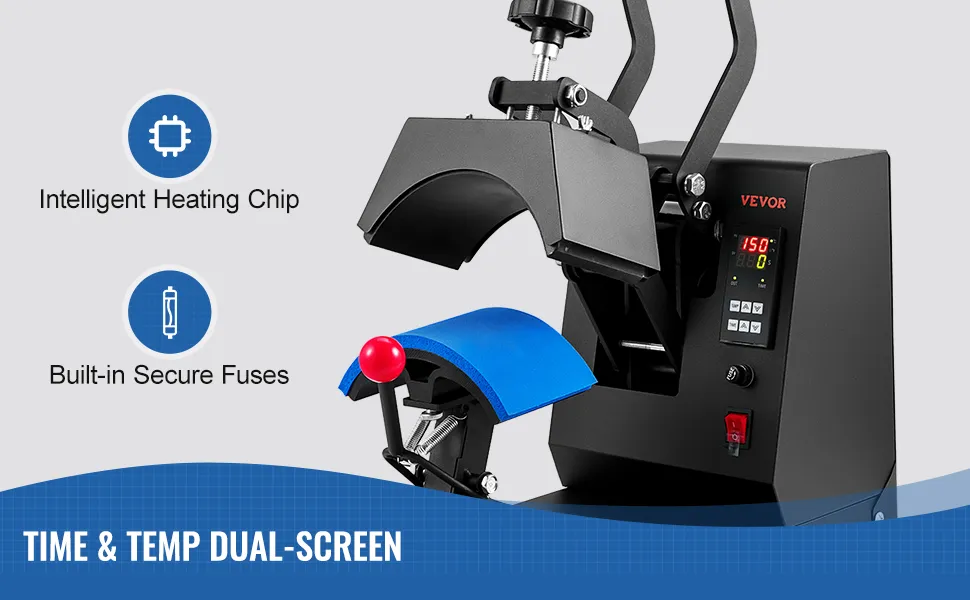 Probleemloze bediening: Uitgerust met een ergonomische handgreep met lange arm om comfort te garanderen bij elke druk. De knop voor volledige drukinstelling kan handmatig worden aangepast, afhankelijk van de dikte van het gebruikte materiaal. De automatische uitschakelfunctie helpt u onze hoedenpers met clamshell-ontwerp gemakkelijk te gebruiken. Al deze functies zijn ingesteld om de hoogste normen te overtreffen en aan al uw behoeften te voldoen.