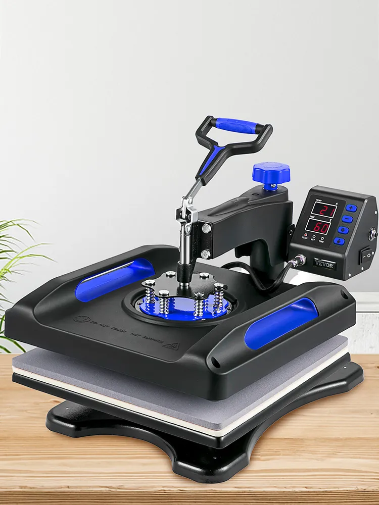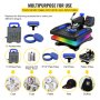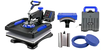 Deze shirtdrukmachine heeft verschillende fittingen, waaronder een platenpers, een hoed / pet-pers, een mokpers, een aluminium potpers en twee plaatpersen, waardoor patronen kunnen worden overgebracht op T-shirts, petten, mokken, borden en andere voorwerpen met een vlak oppervlak.