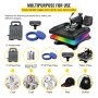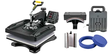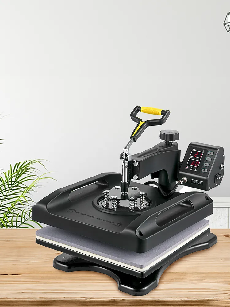 Deze shirtdrukmachine heeft verschillende fittingen, waaronder een platenpers, een hoed / pet-pers, een mokpers, een aluminium potpers en twee plaatpersen, waardoor patronen kunnen worden overgebracht op T-shirts, petten, mokken, borden en andere voorwerpen met een vlak oppervlak.