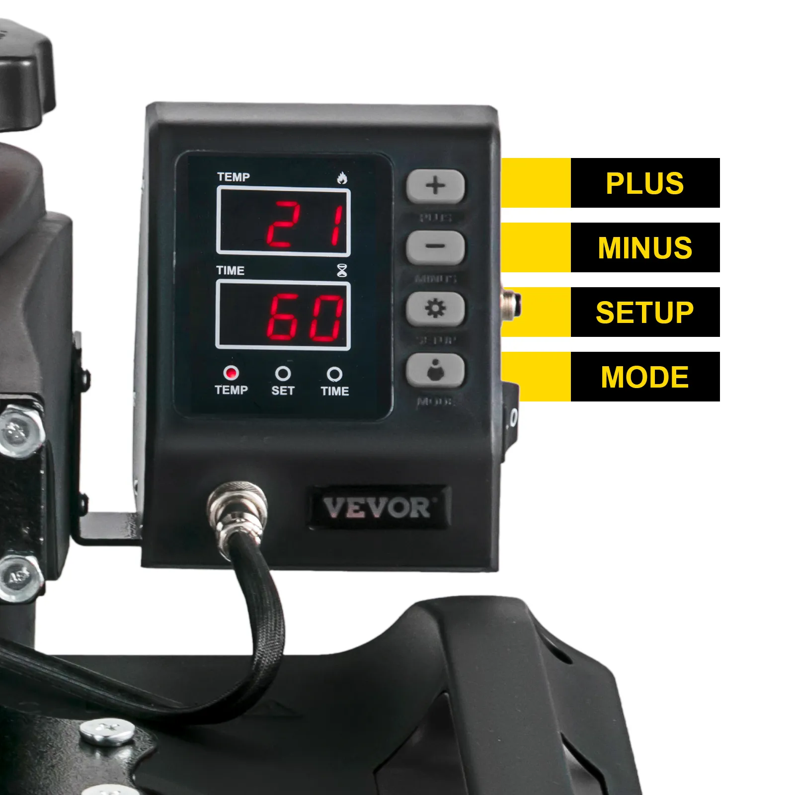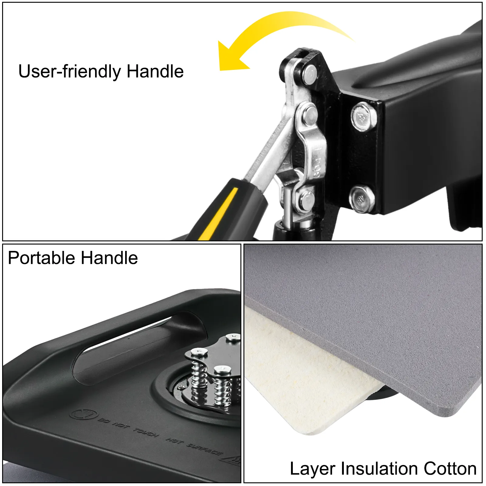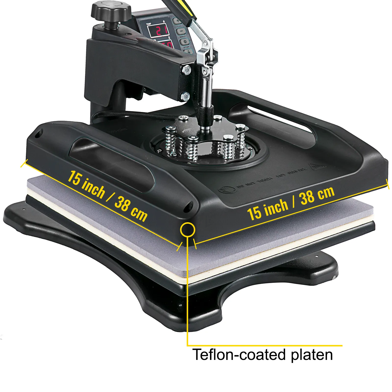 Deze t-shirtpersmachine heeft een 15 x 15 inch (38 X 38 cm) grote verwarmingsplaat, die een groot oppervlak biedt om over te brengen op platte items. De plaat met tefloncoating is niet-klevend, waardoor de transfers niet verschroeien.