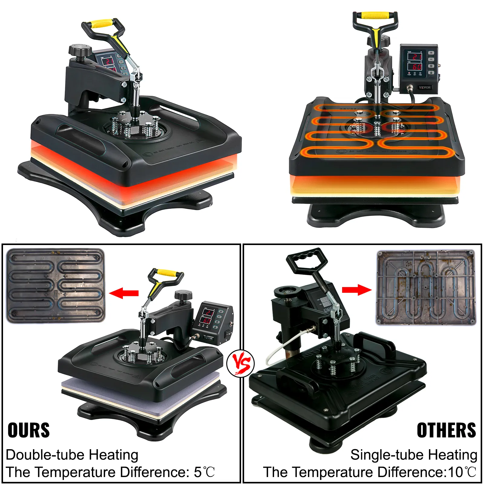 Deze 15 x 15 hittepers maakt gebruik van de nieuwste dubbele buisverwarmingstechnologie en tweelaagse isolatietechnologie om de overdrachtsprestaties te verbeteren. Met betrouwbare moederborden en een nauwkeurig temperatuurregelingsapparaat is de stabiliteit ook verder verbeterd. Alle benodigde accessoires worden geleverd om u de prachtige afbeeldingen op petten, T-shirts, mokken, borden, enz.
