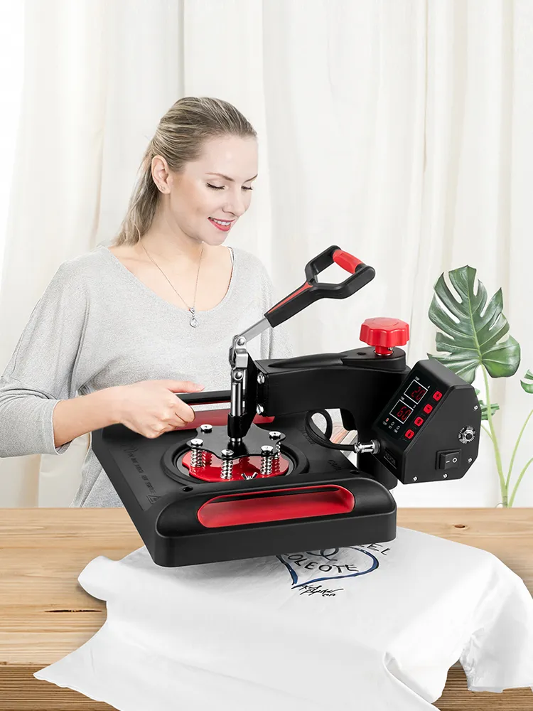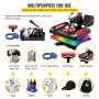 Deze shirtdrukmachine heeft verschillende fittingen, waaronder een platenpers, een hoed / pet-pers, drie mokpers, een aluminium potpers en twee plaatpersen, waardoor patronen kunnen worden overgebracht op T-shirts, petten, mokken, borden en andere voorwerpen met een vlak oppervlak.