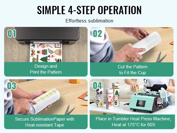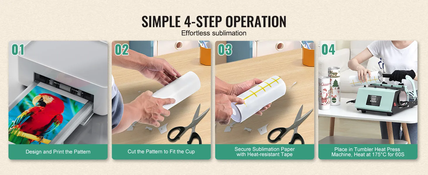 Eenvoudige sublimatie: onze mok-hittepers beschikt over een touchscreen-interface, waardoor u de ingewikkelde installatie bespaart. Ontwerp en print het gewenste ontwerp, knip het op maat voor de mok, bevestig het sublimatiepapier met hittebestendige tape en stel vervolgens de tijd en temperatuur in op het apparaat.
