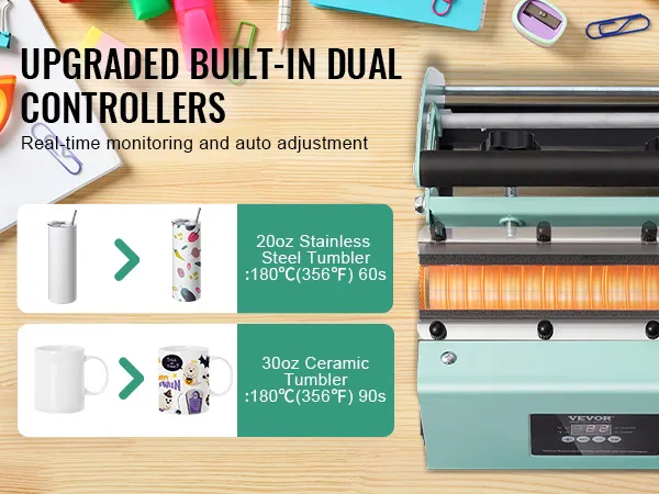 Het verbeterde dubbele controllersysteem biedt realtime monitoring en automatische aanpassing om een soepel sublimatieproces te garanderen. Aanbevolen opwarmtijden voor verschillende kopjes.