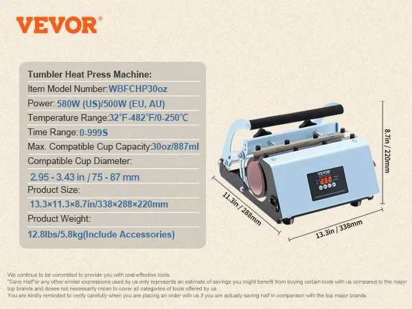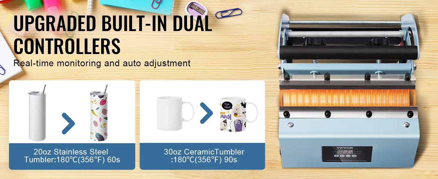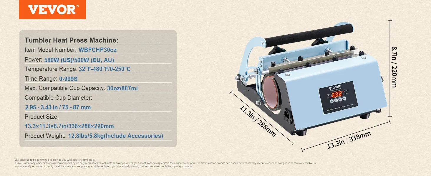 VEVOR Tumbler Heat Press, 11-30 oz Mokpers, Snelle en gelijkmatige verwarming, Tumbler Press met sublimatiepapier, tape en handschoenen, temperatuur- en tijdsinstelling