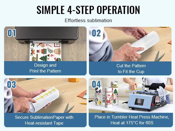 Eenvoudige sublimatie: onze mok-hittepers is voorzien van een touchscreen-interface, waardoor ingewikkelde instellingen overbodig zijn. Ontwerp en print het gewenste motief, knip het op maat voor de mok, bevestig het sublimatiepapier met hittebestendige tape en stel vervolgens de tijd en temperatuur in op het apparaat.