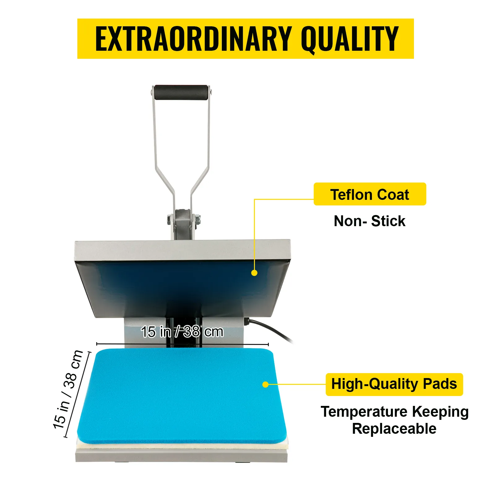 • 【UITSTEKENDE KWALITEIT】 - Met een 15" x 15" (38 x 38 cm) grote hitteplaat biedt de hittepers een groot oppervlak om over te brengen op voorwerpen met een plat oppervlak. Door gebruik te maken van de met teflon gecoate plaat is deze antikleef en stabiel, waardoor verschroeien van transfers wordt voorkomen.