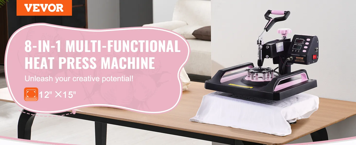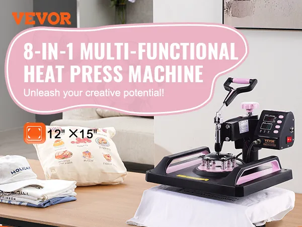 VEVOR Heat Press Machine, 12 x 15 inch, 8 in 1 Heat Transfer Machine with 30 oz Tumbler Press, 360° Swing Away Digital T-Shirt Pressing, Teflon Coating, for T-Shirts/Mugs/Hats/Plates, Black+Pink