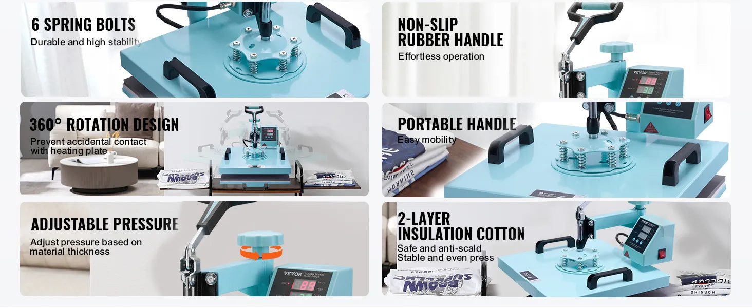 Dubbele isolatie: Dankzij de dubbele isolatie bereikt de oppervlaktetemperatuur van de overhemdenpers slechts 50-70°C, ook al komt de werktemperatuur boven de 210°C. Ter vergelijking: conventionele strijkijzers kunnen temperaturen bereiken van 70-100°C. Dit vermindert het risico op brandwonden en zorgt voor een stabiele temperatuur tijdens het overdrachtsproces, waardoor bij elke overdracht perfecte resultaten worden gegarandeerd.