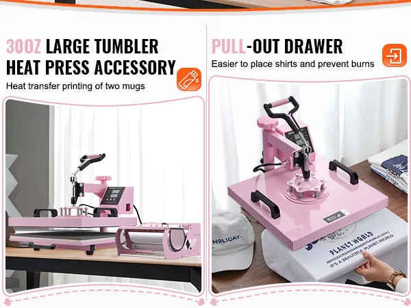 The upgraded 30oz large tumbler press attachment can hold two standard-sized mugs, making your work more efficient! Our heat press machine features a pull-out drawer design to enhance safety, preventing burns when placing and removing items.