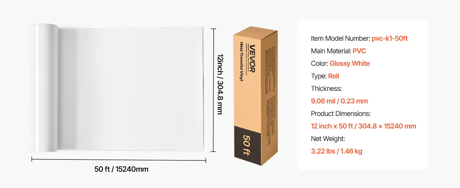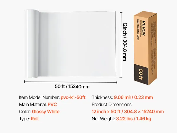 VEVOR Heat Transfer Vinyl (304,8 x 15240 mm), glanzend wit HTV strijkvinylrol, compatibel met snijmachines, voor diverse materialen: T-shirts, kussens, hoeden