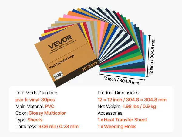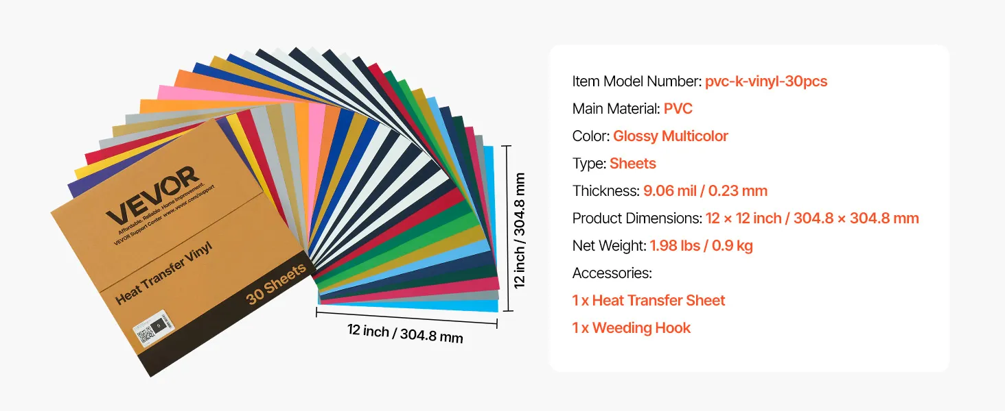 VEVOR Heat Transfer Vinyl (304,8 x 304,8 mm) 30 vellen, diverse kleuren, plotterfilm compatibel met snijmachines, strijkfolie voor T-shirts, kussens, hoeden