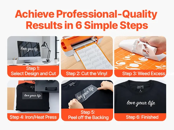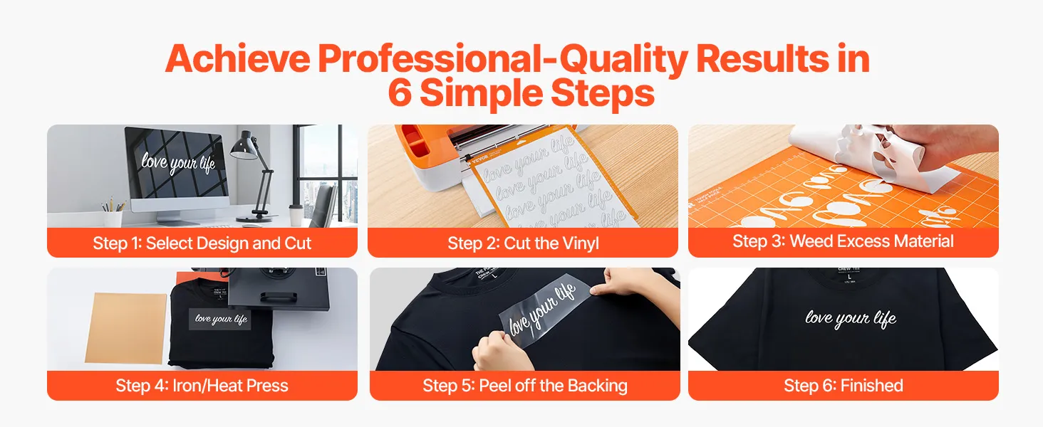 Onze T-shirt transferfolie is eenvoudig te gebruiken: ontwerp je ontwerp, knip het vinyl uit, verwijder het, plaats het op het gewenste item, breng warmte aan en verwijder de rugfolie. Zelfs beginners op het gebied van warmteoverdracht kunnen gemakkelijk een professioneel resultaat bereiken.