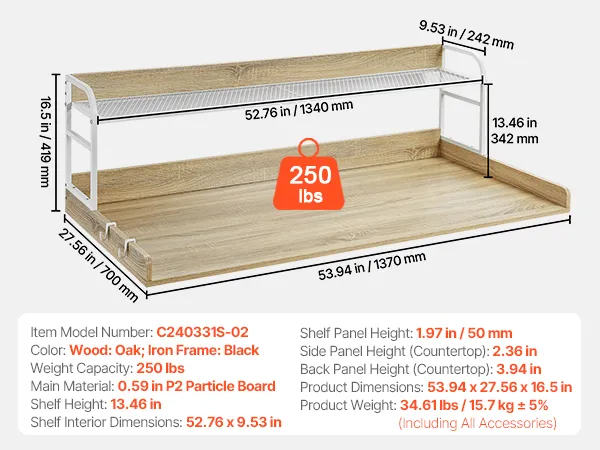 VEVOR Washer Dryer Countertop with 2-Tier Shelf, 54" x 27" Wooden Washer and Dryer Countertop with Anti-Slip Pads, Water-Resistant Laundry Topper Cover for Laundry Room Organization and Storage, Oak