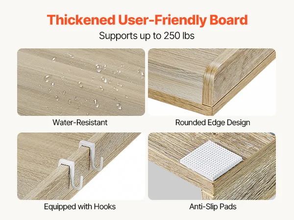 Made from high-quality P2 CARB wood, with a 15mm thick surface, this friendly material is heat, water, and scratch resistant, supporting up to 250 lbs. Equipped with practical side hooks for hanging small items, it’s built to withstand daily use and ensures long-lasting stability.