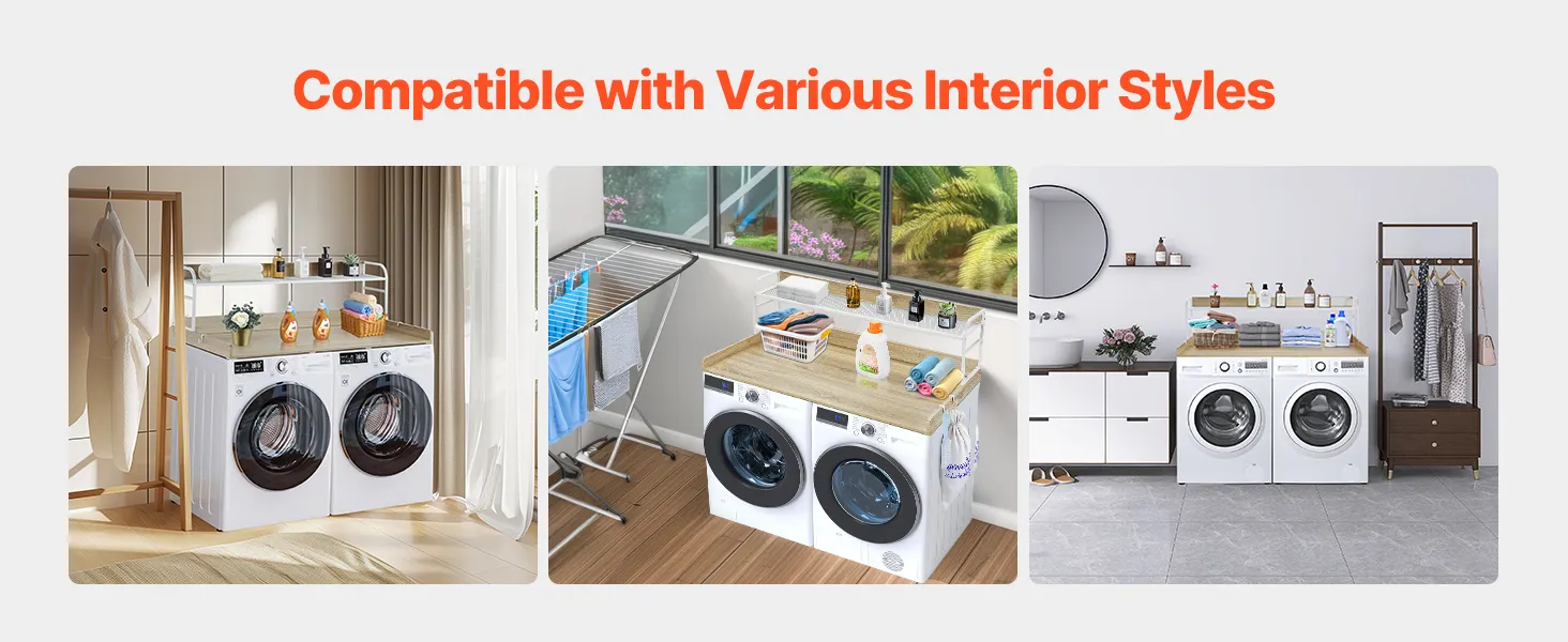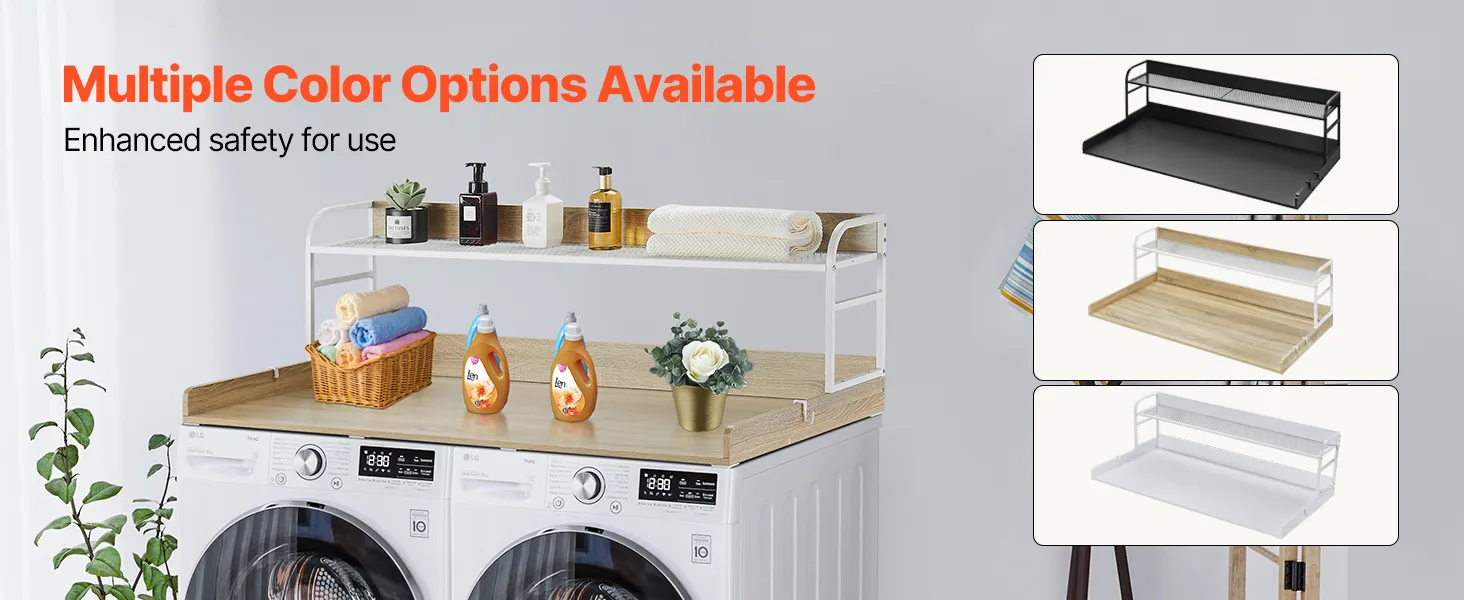 Available in black, white, and oak finishes, this washer dryer counter top complements various washer and dryer models and seamlessly blends with your home decor, creating a visually harmonious space.