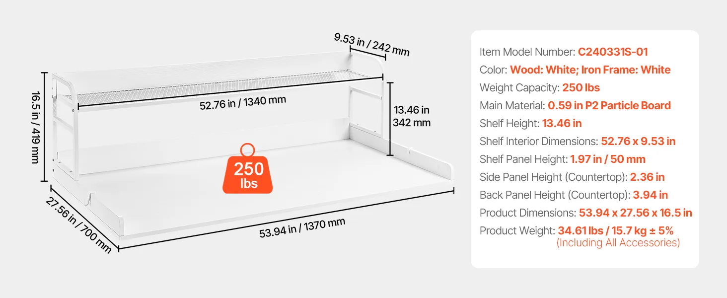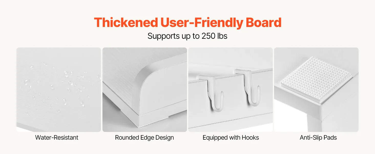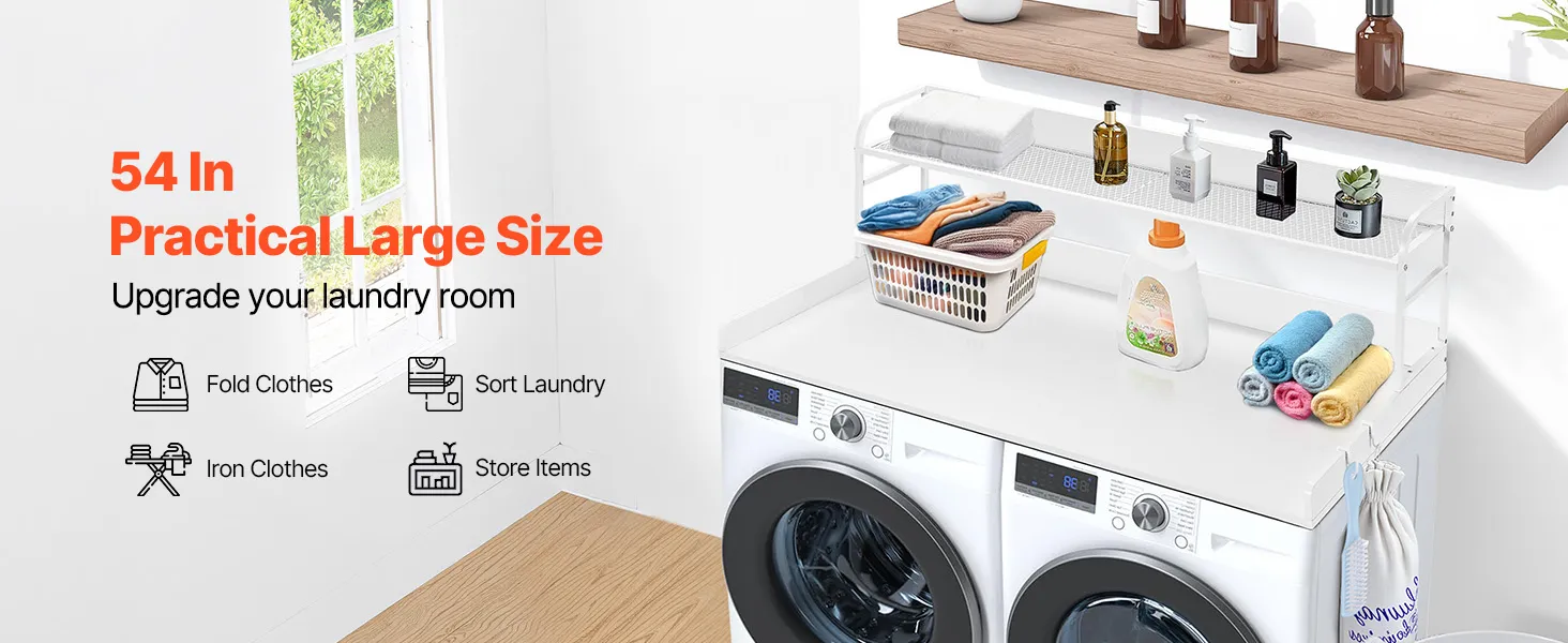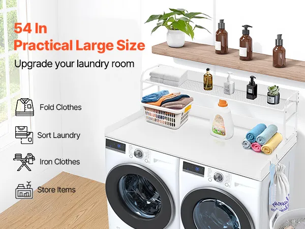 Met een lengte van 137 cm en een breedte van 70 cm biedt deze wasmachinewerkbank een ruim werkblad voor uw wasruimte. Of u nu de was opvouwt, de was sorteert of wasmiddel opbergt, dit grote werkoppervlak voldoet aan uw behoeften.