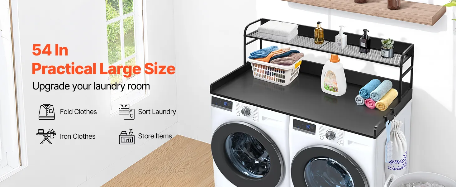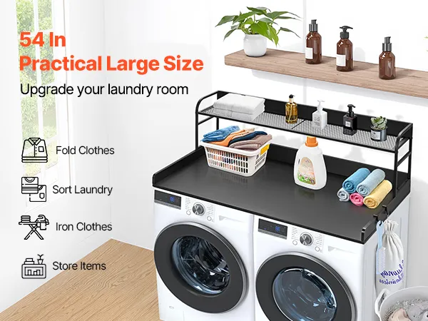 Functional Space: With a spacious surface measuring 54 inches in length and 27 inches in width, this laundry room organization transforms your laundry room into a functional workspace. And it also comes with a storage shelf for convenient stroage of detergent and laundry basket. It offers ample room for folding, ironing, and other laundry tasks.