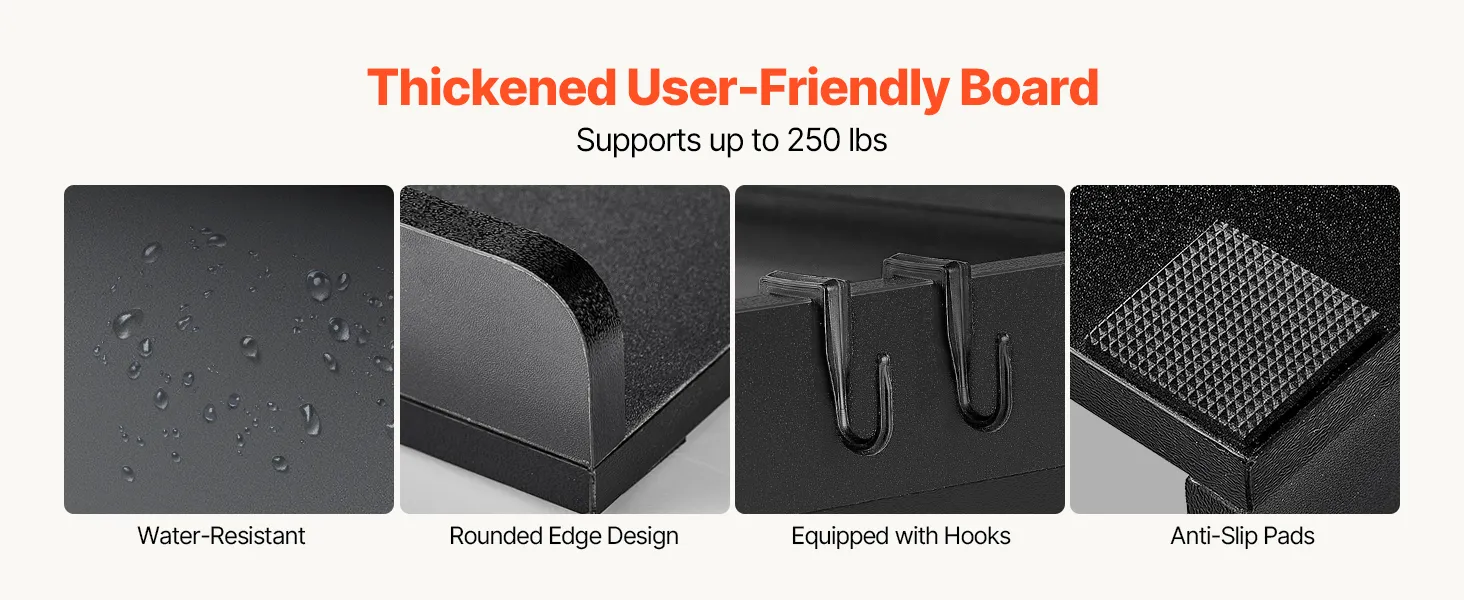Made from high-quality P2 CARB wood, with a 15mm thick surface, this friendly material is heat, water, and scratch resistant, supporting up to 250 lbs. Equipped with practical side hooks for hanging small items, it’s built to withstand daily use and ensures long-lasting stability.