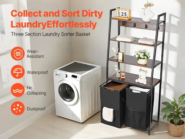 Moeiteloos sorteren en opbergen: vier stoffen zakken en één buitenvak bieden een totale capaciteit van 24,34 gallon. Scheid gemakkelijk lichte en donkere kleding, kleding voor volwassenen en kinderen, of sokken en handdoeken.