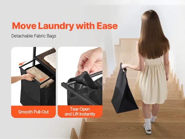 Dankzij de uitneembare zakken met een soepel uittrekontwerp en handgrepen kunt u de wassorteerder uw kleding in één keer naar de wasmachine transporteren, wat tijd en moeite bespaart.