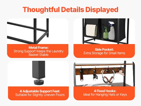Het versterkte metalen frame zorgt voor blijvende stabiliteit en duurzaamheid. Vier verstelbare poten zorgen voor een stevige basis op oneffen vloeren. De kast heeft een zijvak en een veilige haak voor het opbergen van kleine spullen zoals sokken, waszakken en sleutels – voor een opgeruimde en efficiënte wasruimte.