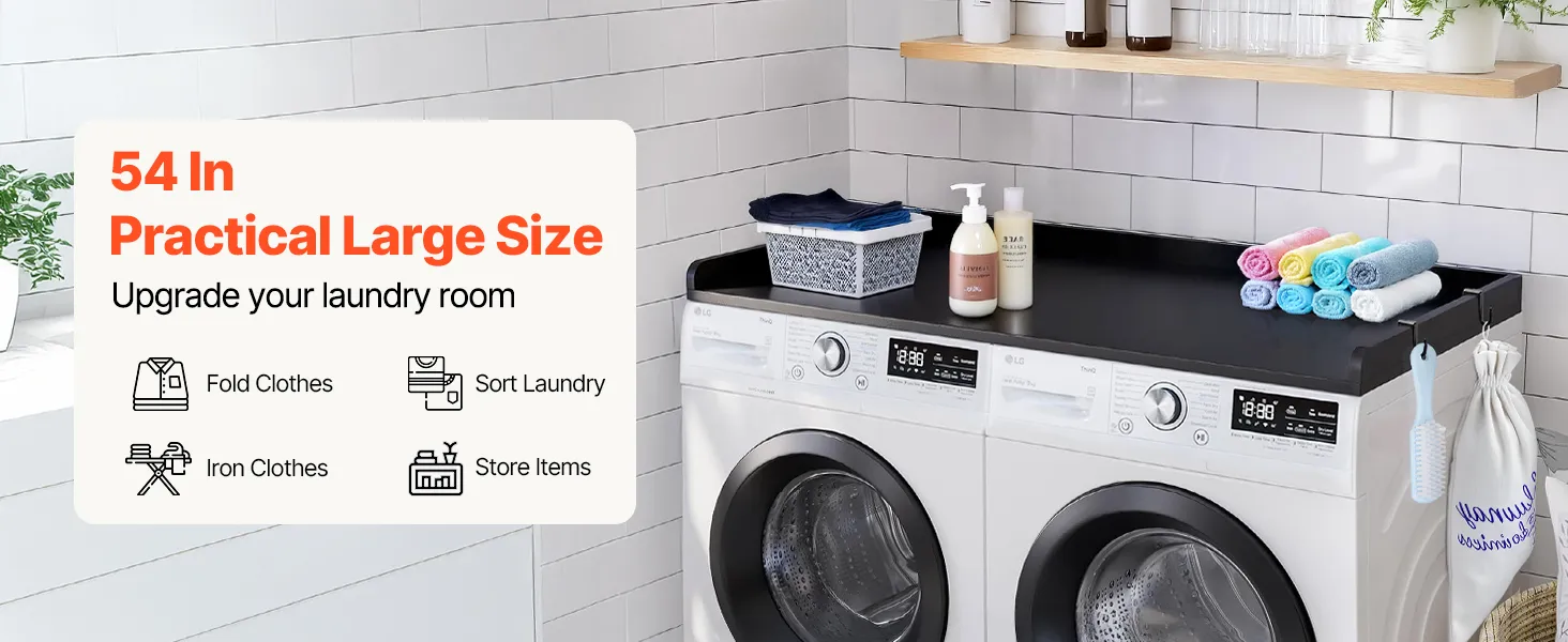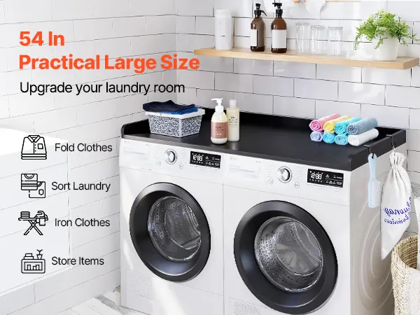 Functionele ruimte: met een ruim oppervlak van 1370 mm (53,97 inch) lang en 700 mm (27,56 inch) breed, verandert deze wasruimte-organizer uw wasruimte in een functionele werkruimte. Hij biedt veel ruimte voor opvouwen, strijken en andere waswerkzaamheden.