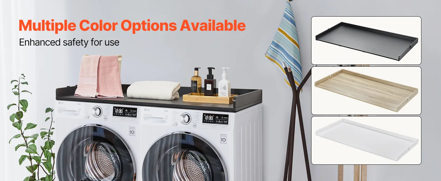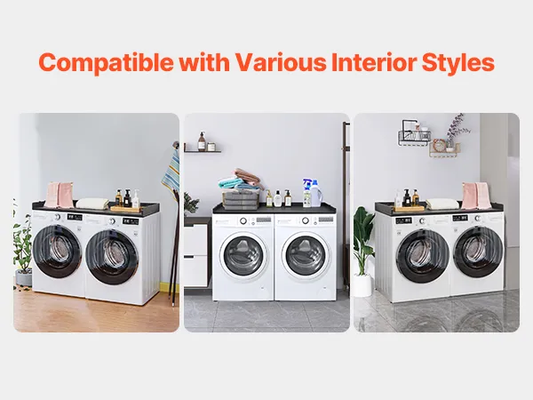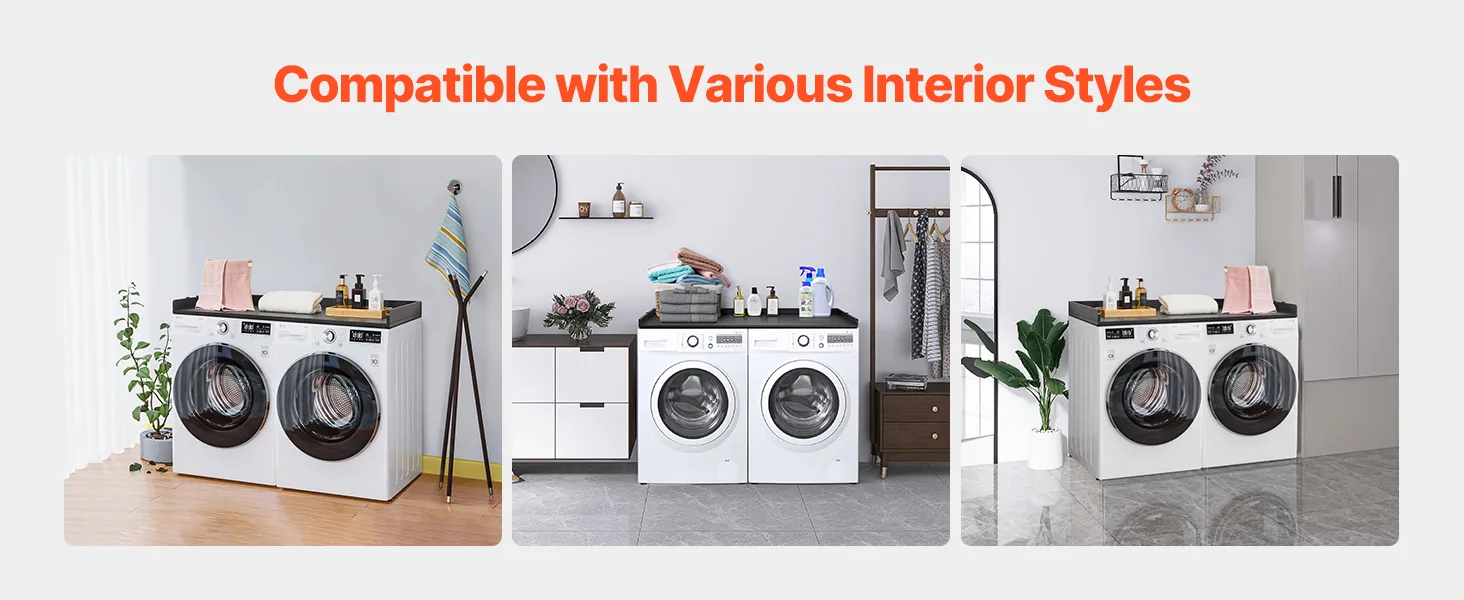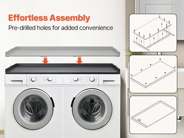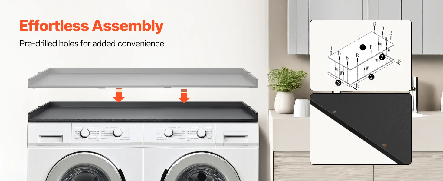 Eenvoudig te monteren: wordt geleverd met alle benodigde instructies en accessoires voor een snelle montage. De voorgeboorde gaten zorgen voor een eenvoudige montage in slechts enkele minuten. Het aanrecht van de wasmachine en droger bevat ook acht antislipkussentjes om uw oppervlakken te beschermen en uitglijden te voorkomen.