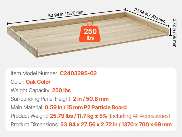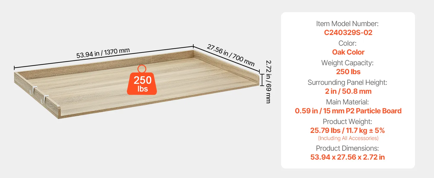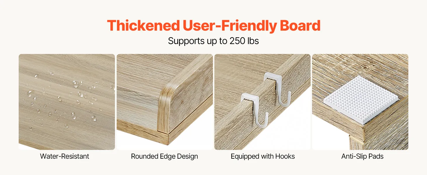 Gemaakt van hoogwaardig P2 CARB-hout met een 15 mm dik oppervlak, hitte-, water- en krasbestendig. Hij kan maximaal 113 kg dragen. Uitgerust met praktische zijhaken voor het ophangen van kleinere voorwerpen, is hij ontworpen voor dagelijks gebruik.