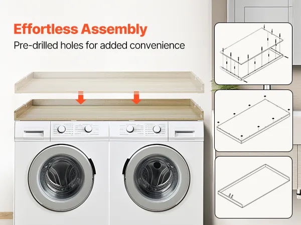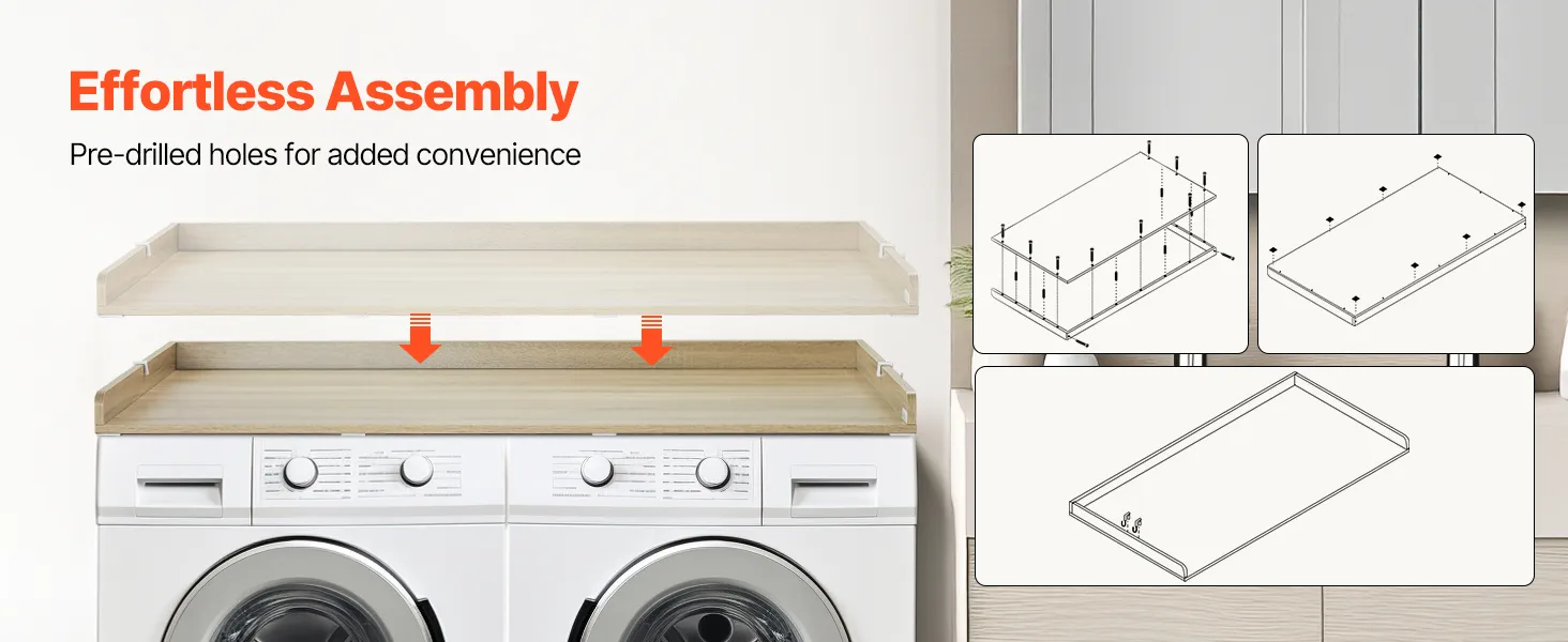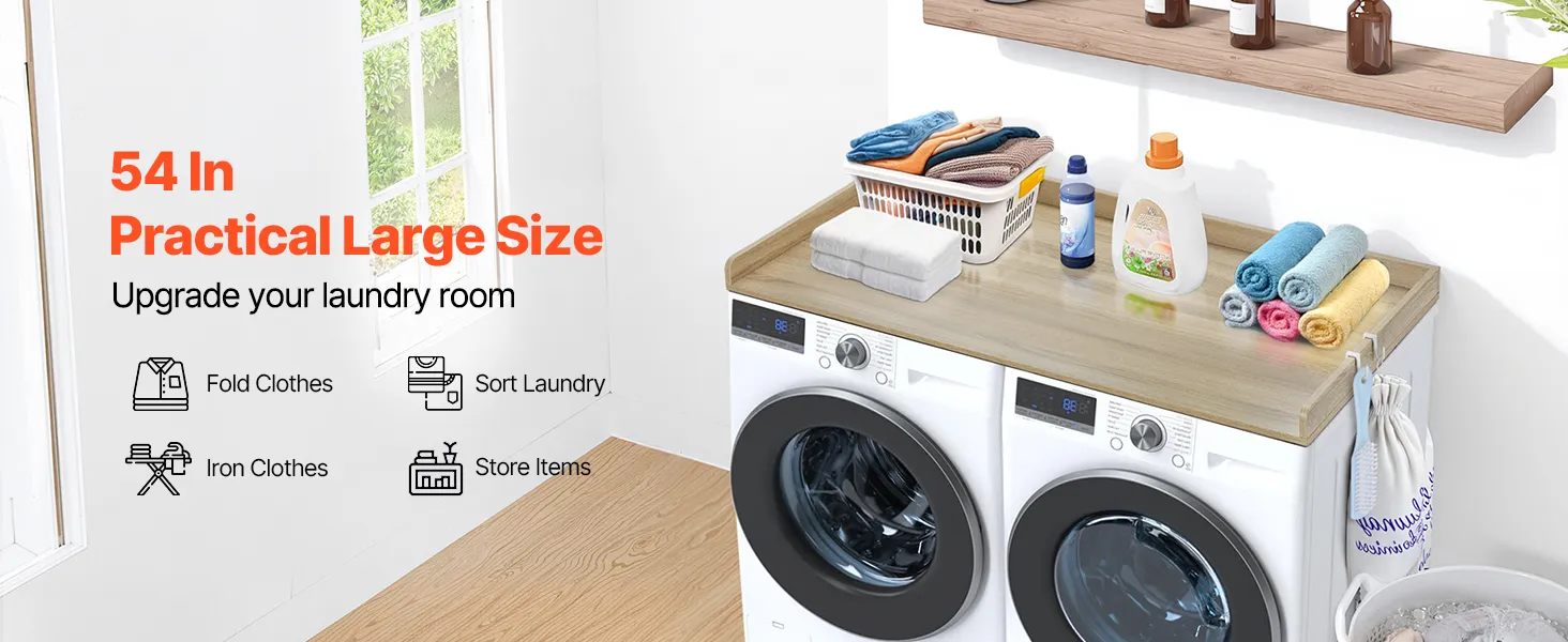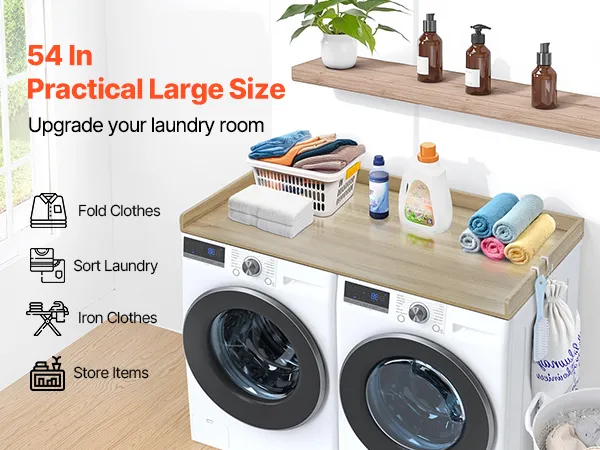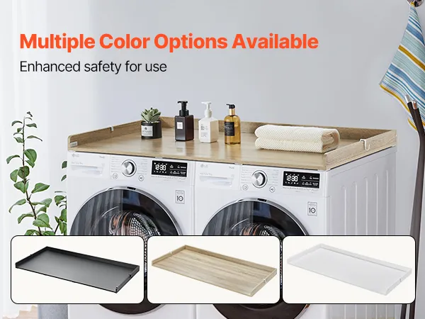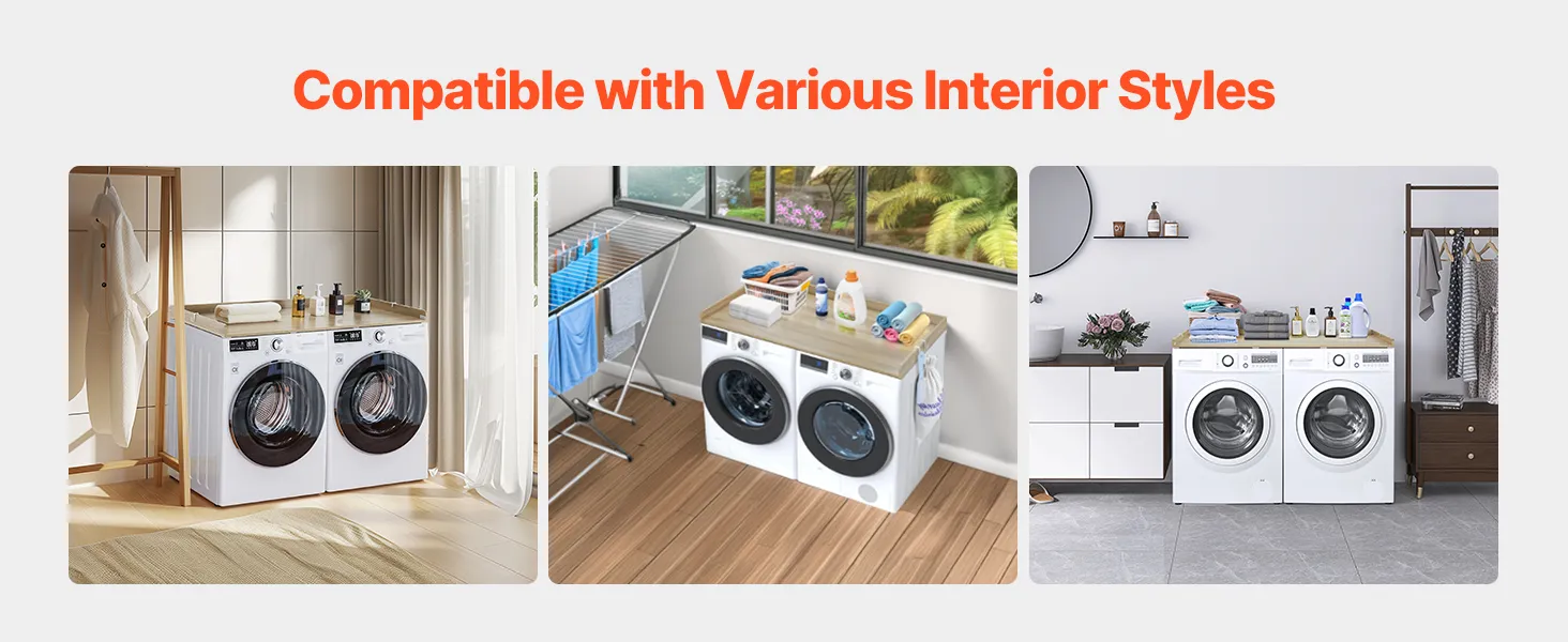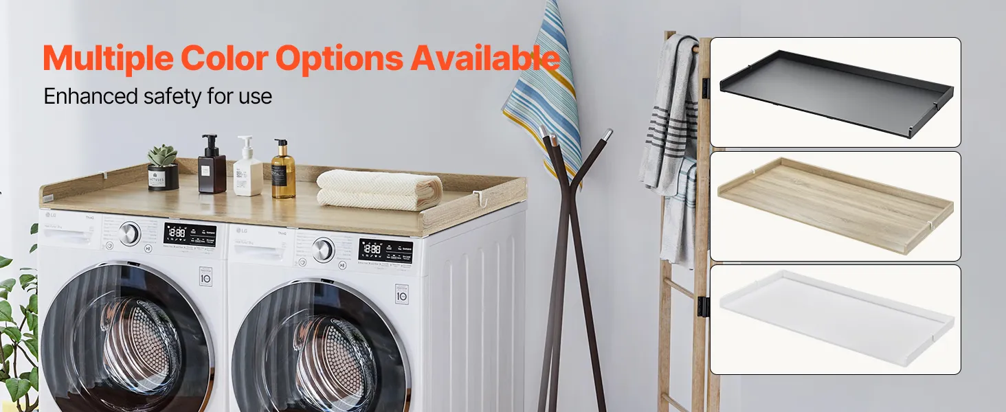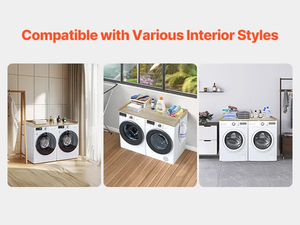 VERSCHILLENDE STIJLEN: Eiken, wit en zwart blad, meerdere kleuropties maken dit wasmachineblad een naadloze aanvulling op elk interieurontwerp. Het gladde oppervlak zonder gaten of scherpe hoeken combineert functionaliteit en esthetiek voor een moderne, harmonieuze uitstraling.