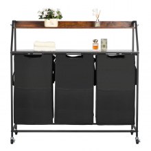 VEVOR 2 Tiers Laundry Sorter, Tall Laundry Hamper with Metal Frame and Wooden Tabletop, 3 Section Rolling Basket Organizer Storage with Ladder Shelves and 600D Oxford Cloth Bags for Dirty Clothes