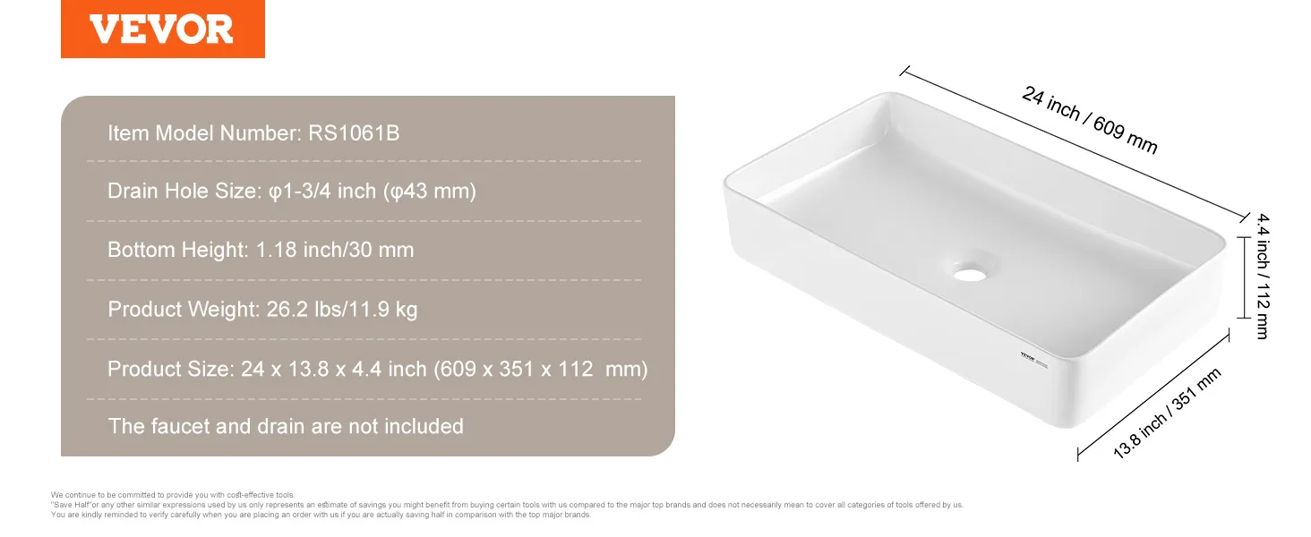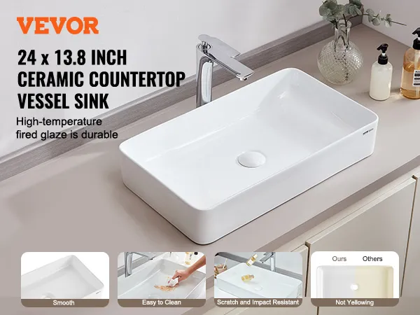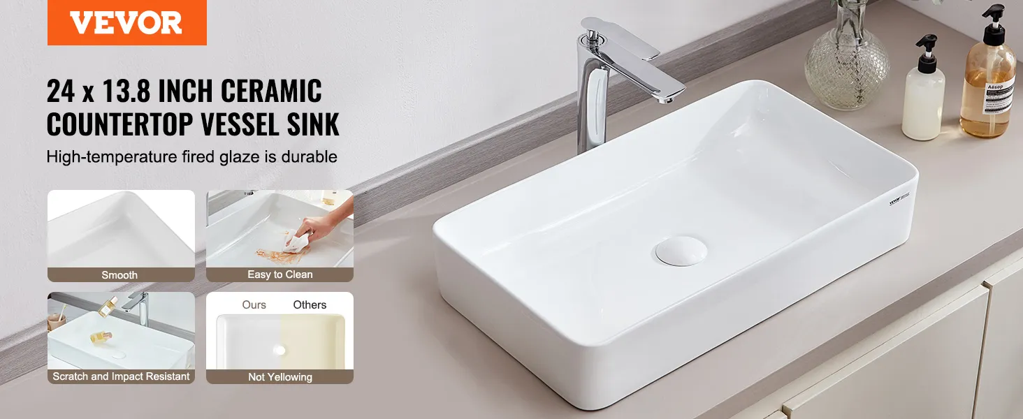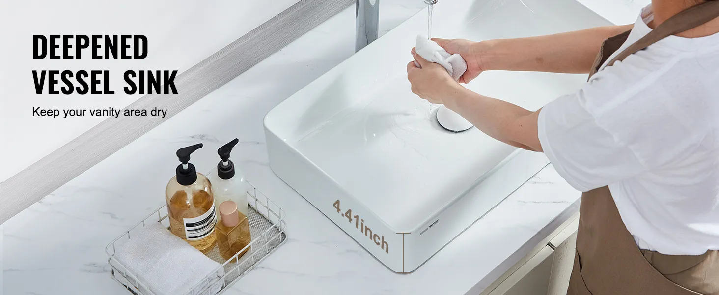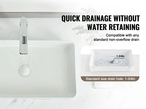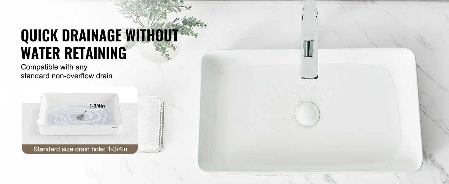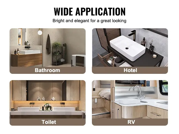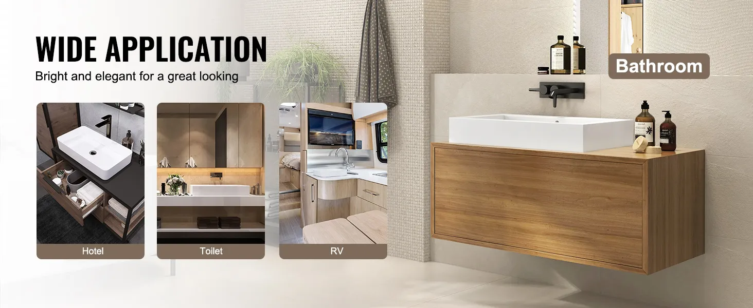 With its minimalist rectangular shape and understated white color, this sink exudes beauty and luxury. It complements a variety of decor styles and is popular among homeowners for use in bathrooms and vanities. It is also suitable for hotels, RVs, restaurants, office buildings, and more.