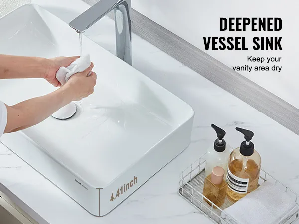 This vessel sink features a deep design that effectively prevents water splashes from spilling over the edge, keeping your countertop dry and clean.