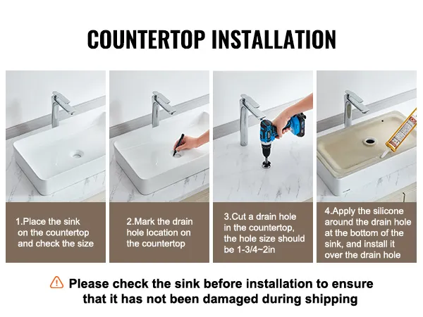 The sink is surrounded by foam padding to prevent damage during transport. Please check the sink before installation to ensure it has not been damaged in transit. Follow the instructions in the manual for a simple 4-step installation process.