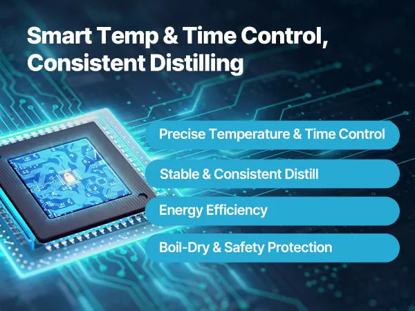 Efficiënte destillatie: De 900-watt waterdestilleerder werkt met een capaciteit van meer dan 1,3 liter per uur en verwijdert de meeste onzuiverheden uit kraanwater. Hij kan in totaal 31,2 liter per dag destilleren.