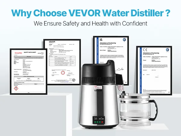 Hoogwaardige materialen: De distillatiewatermaker heeft een watertank van roestvrij staal 304. De container is gemaakt van borosilicaatglas en alle onderdelen die in contact komen met water zijn gemaakt van voedselveilige materialen.