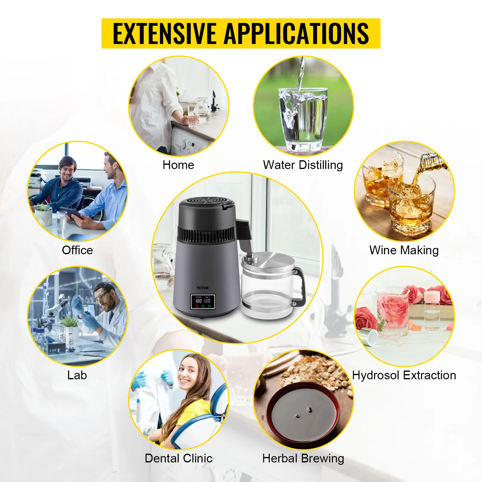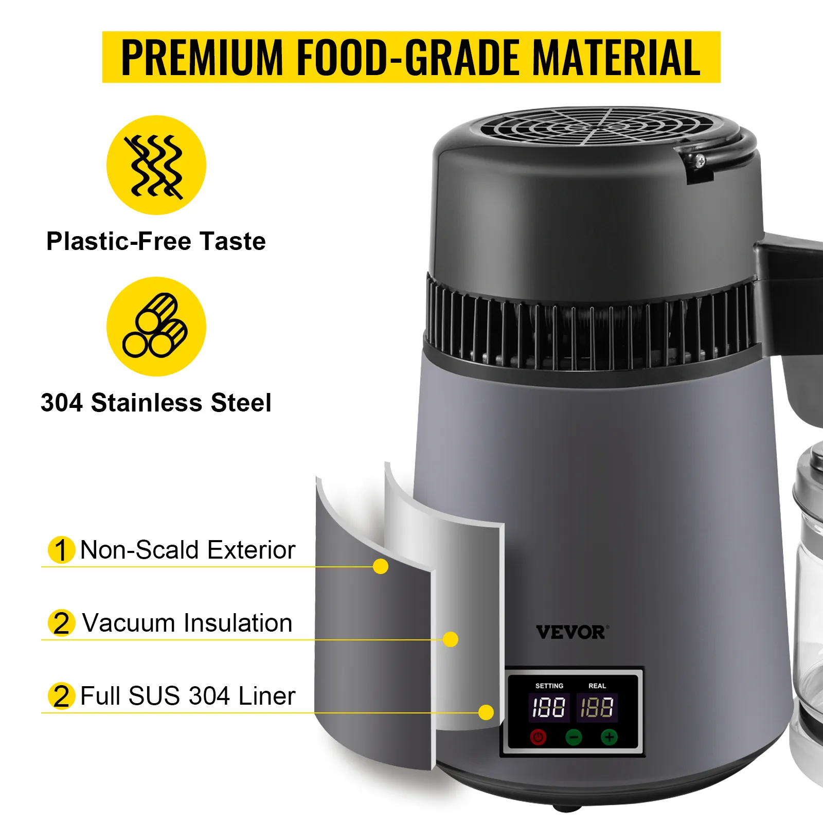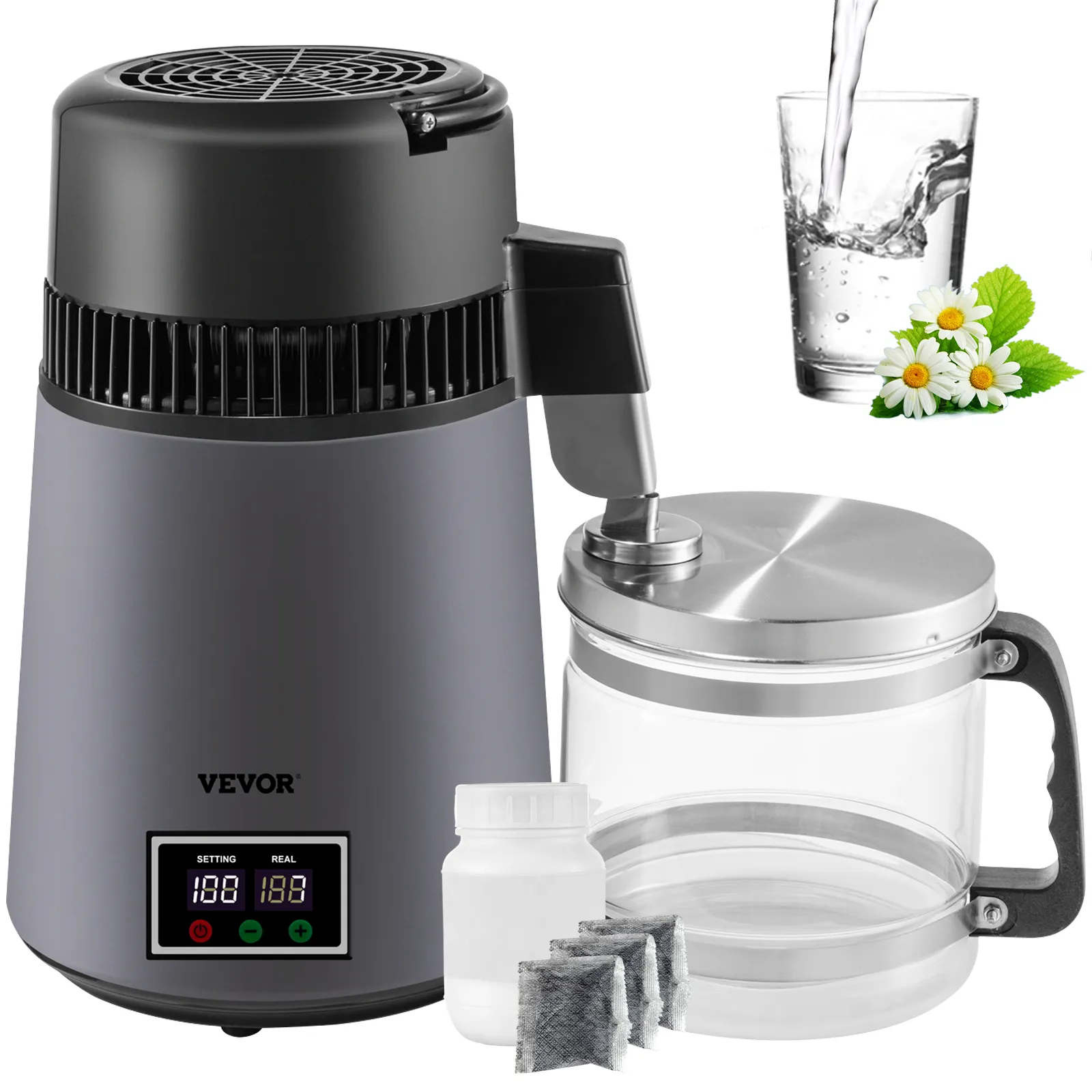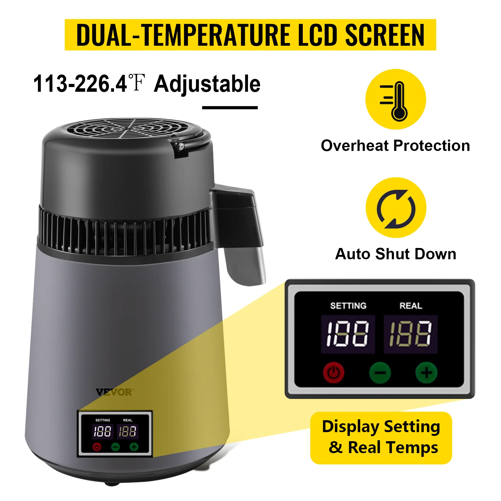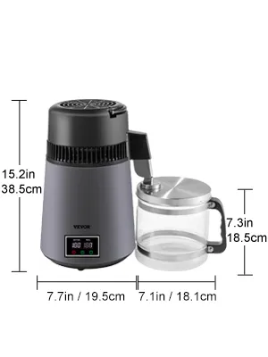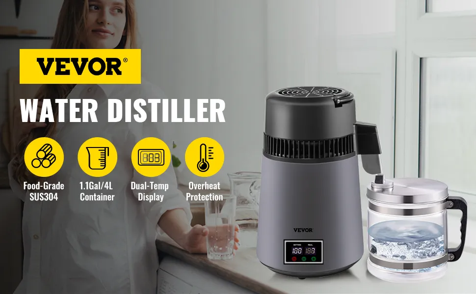 VEVOR's water distiller is a perfect tool for purifying your water and helping you get a constant supply of distilled water, whether you're at home or in the office. This distiller can effectively dissolve VOCs and filter other impurities, and the distilling speed reaches up to 1 L (0.26 Gal) of water per hour. What's more, as a perfect match for a tiny kitchen, it is not much bigger than a kettle in size and won't take up so much of your space.